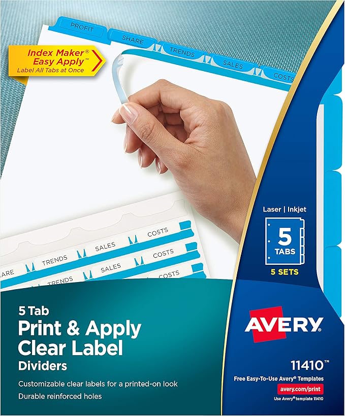 Amazon Com Avery 5 Tab Binder Dividers Easy Print Apply Clear Label Strip Index Maker Blue Tabs 5 Sets 11410 Binder Index Dividers Office Products