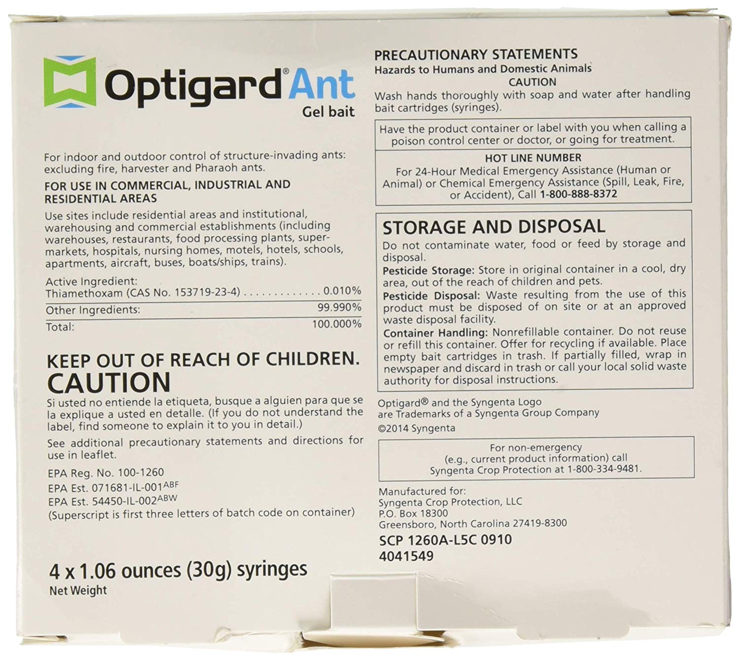 Syngenta - TRTD11568 - Optigard Ant Bait Gel Box - 4 Tubes w Plunger - 30g each tube. OPTIGARD ANT GEL BAIT Manufacturer. Always read the label.