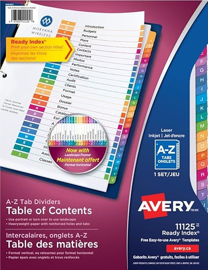 Avery Ready Index Customizable Table of Contents Dividers. Click here to learn more about these dividers. A printable index page helps you search the binder quickly while the individual letter dividers keep everything in the correct place.